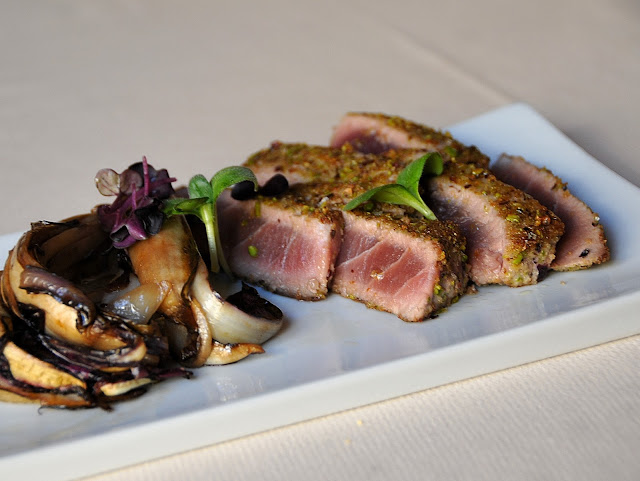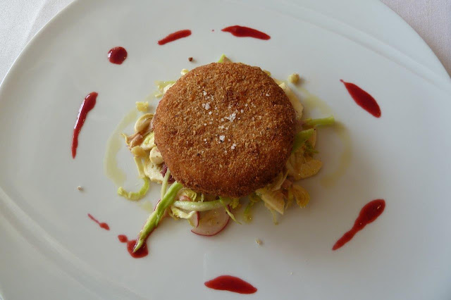Toma panata in crosta di nocciole con misticanza e ristretto ai frutti rossi