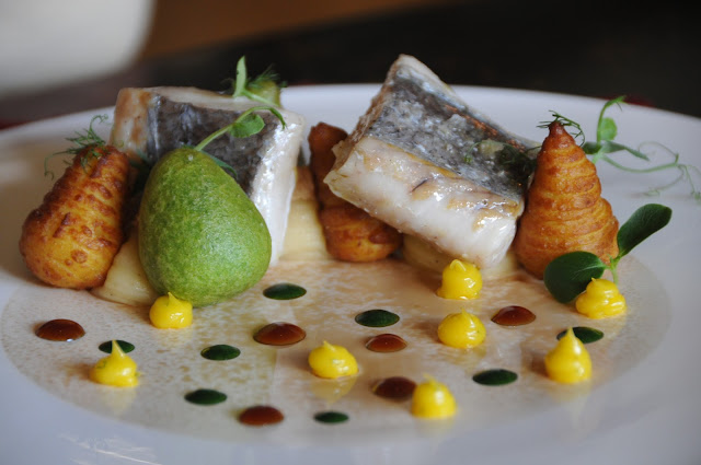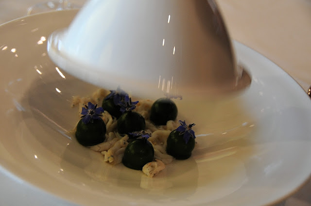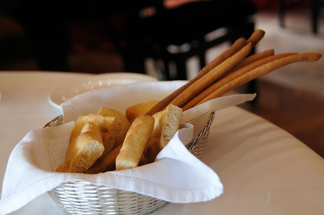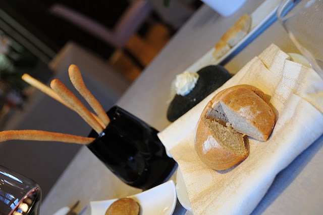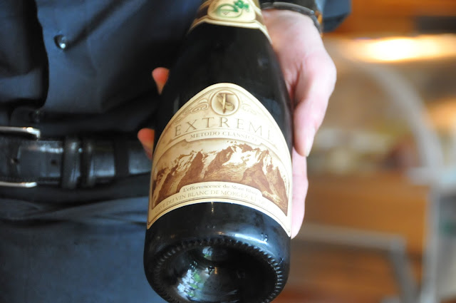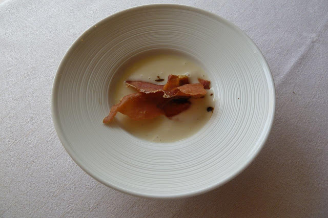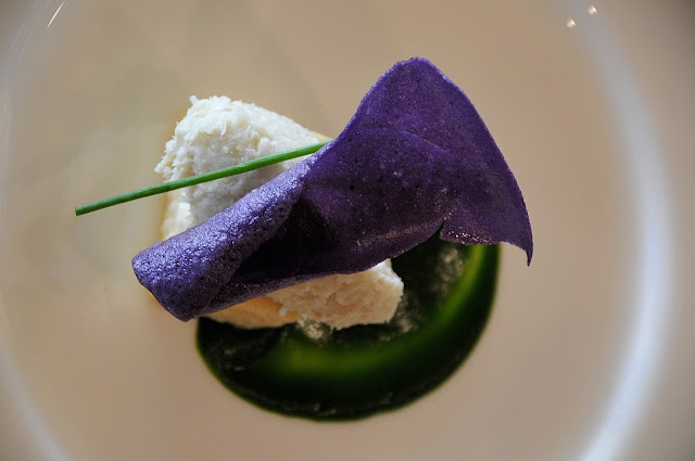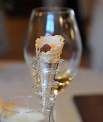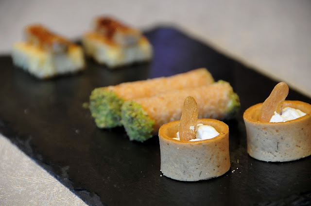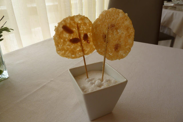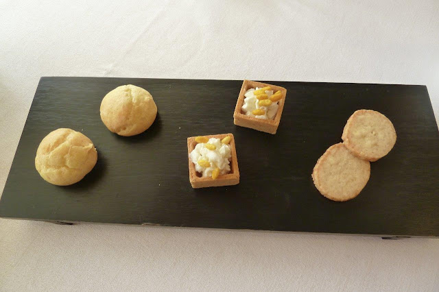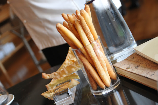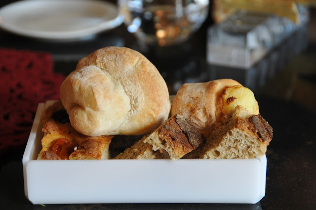 La cucina si presenta e mette subito le cose in chiaro, cialda di parmigiano alle arachidi, bigné di caprino e zucca, tartelletta con ricotta e chicchi di riso soffiato al curry e poi ancora, baccalà panato, crema di patate con aceto della Val di Scalve e "cialda" di crudo, pane e grissini in diverse versioni (tutto autoprodotto e freschissimo) e un paio di calici di bollicine trentine.