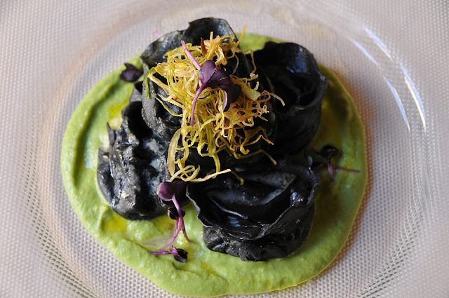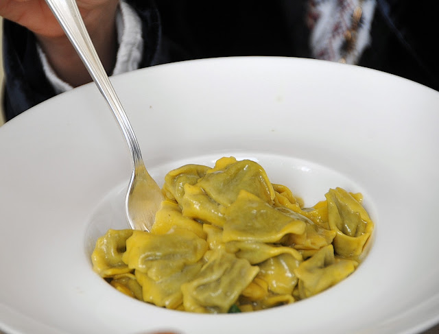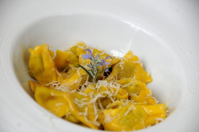 Ravioli di zucca, fonduta di Casera e pop corn di maialino
