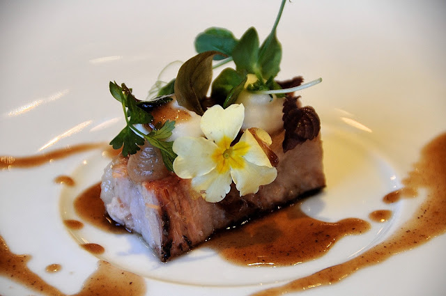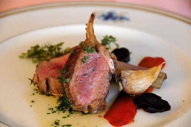 Lombo d'agnello cotto nel fieno su polenta bianca e salsa al vino rosso